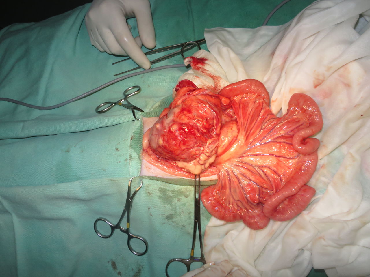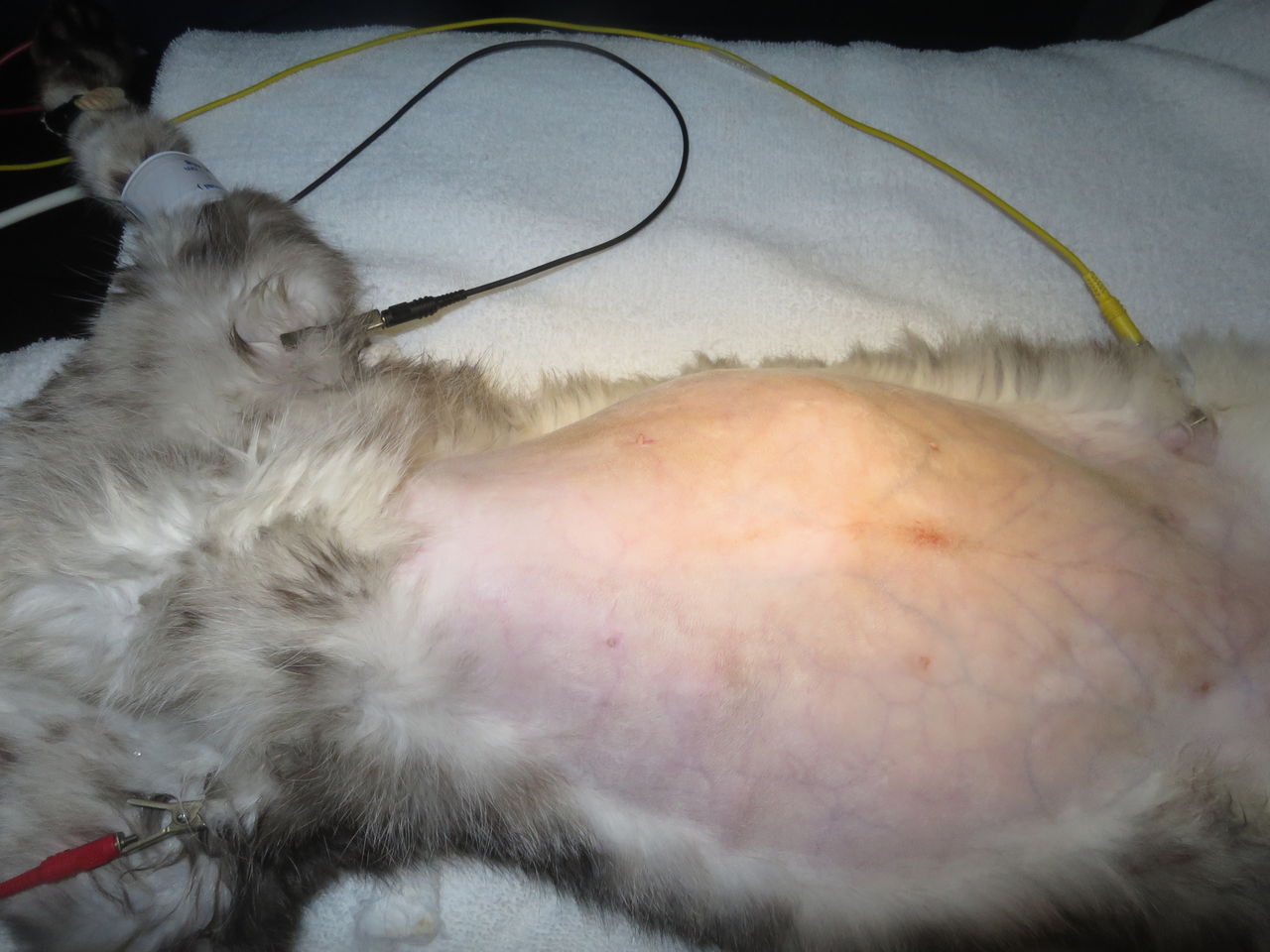 本日の症例は、食欲がなく、お腹が膨れているということで来院されたネコちゃんです。 消化管が圧迫されてしまっているせいか、嘔吐も見られました。 超音波検査で腹水の貯留と腹腔内に6cm程ある腫瘤が認められました。 針生検による細胞診では由来不明の悪性腫瘍という結果でした。 CT検査では、腫瘤の中に脾臓に行く動脈などを巻き込んでいるような像が認められましたが、 腫瘤の発生部位は特定できませんでした。 そこで、試験的開腹を行うことになりました。こちらは手術前の写真ですがこのようにお腹が膨れてしまっています。