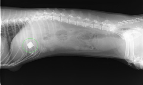 元気と食欲がなく、下痢や吐き気もあるとの事で、13歳のワンちゃんが来院されました。X線検査を行った所、お腹の中に白い四角い物体(緑丸の中)が確認されました。 X線検査では、金属などの硬い物質が白く写ります。