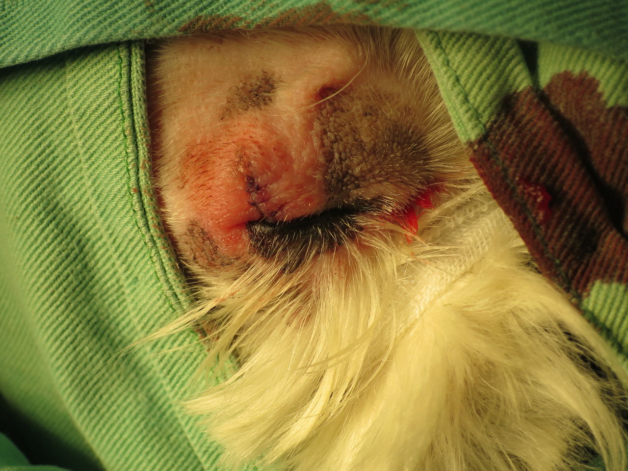 「大分前よりあった」との瞼の腫瘤(イボ)が大きくなってきたわんちゃん、 どんな腫瘤なのかを知るために細い針を刺して細胞を吸引する細胞診を行いました。結果は「マイボーム腺上皮腫」。良性のイボなので転移や生命を脅かすことは考えにくいですが、瞼にあり、裏側まで浸潤しているため大きくなると目を傷つけたり慢性の角膜炎・結膜炎の原因になりえます。 そこで切除することになりました。